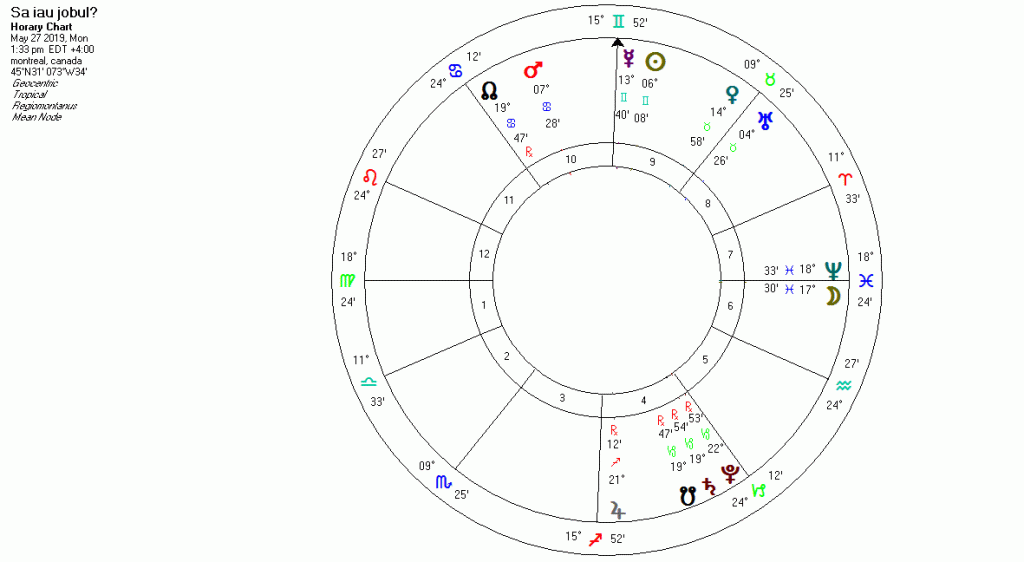 Intrebare: Sa iau jobul? Asc 18.24 Fecioara, 1:33 pm, 27 mai 2019, Montreal, Quebec.